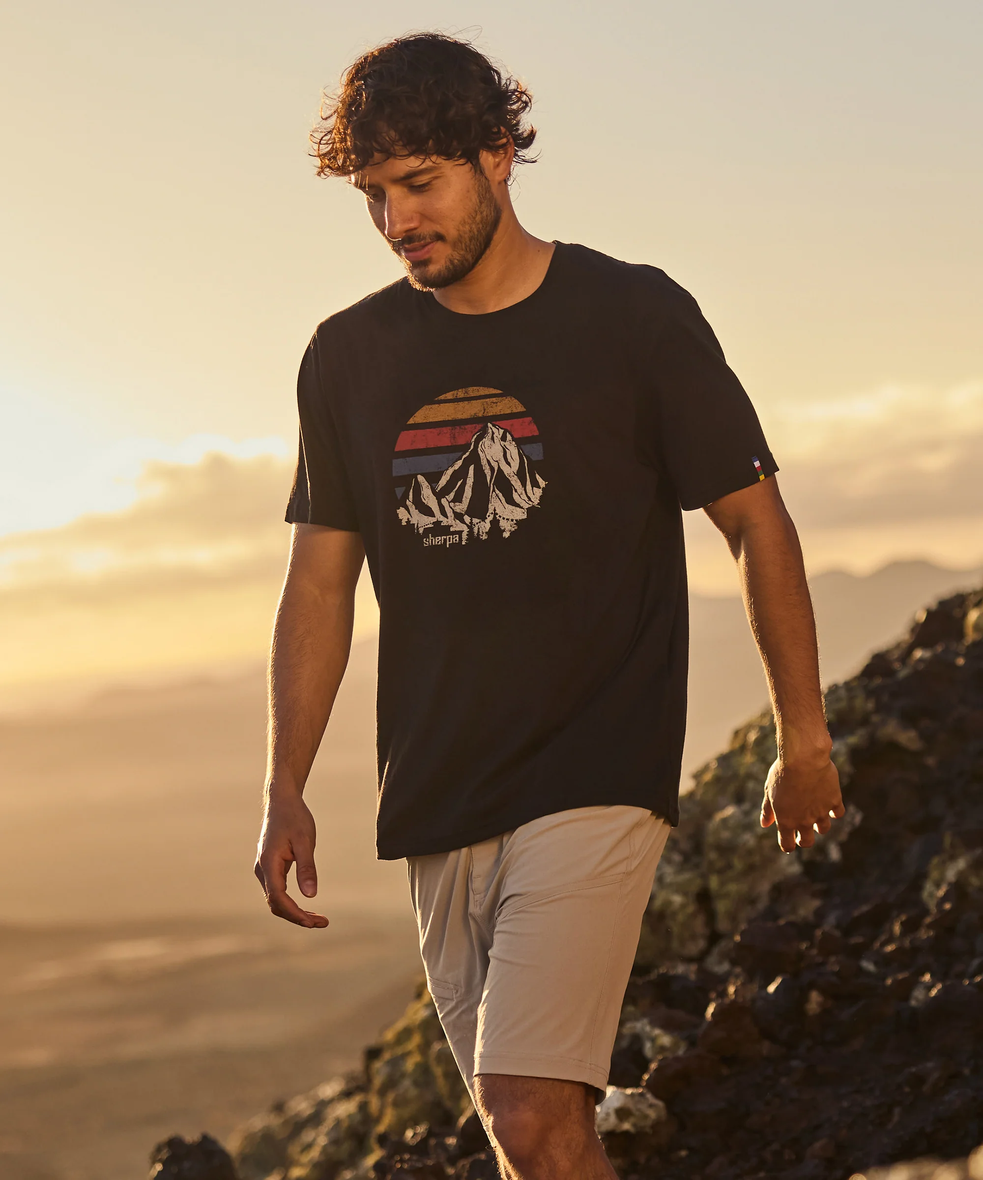 Vintage styling with a modern twist, the Bali Retro Sunset Tee is primed and ready for action. Helping to reduce landfill waste, recycled polyester is blended with Tencel™ and organic cotton, providing next-to-skin softness, breathability, moisture wicking, and lasting comfort. Cut with short set-in sleeves, this classic fit crew neck incorporates our signature prayer flag tape at the back of the neck, ensuring a clean finish, as well as preventing over-stretching. Featuring a striking impression of a sun setting behind the imposing majesty of the Himalayas, the Bali Retro Sunset Tee will see you in style from dawn to dusk.