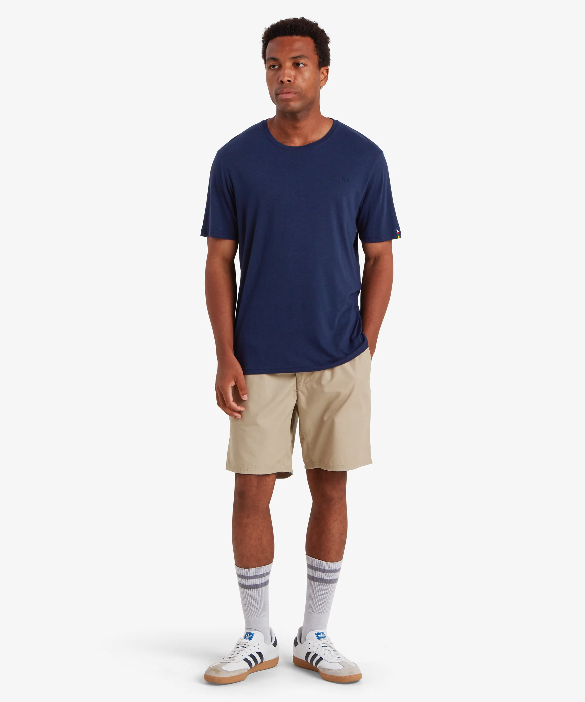 With classic crew neck styling and set-in sleeves, the Bali Tee is perfect for everyday adventures. Made from recycled cotton and recycled polyester, the fabric blend delivers softness and breathability, wicking excess moisture from the skin for dry, comfortable wear. Sherpa's signature prayer flag tape at the back of the neck evokes Nepali heritage, providing a clean, stylish finish, and a practical solution to prevent over-stretching. An additional prayer flag pip appears on the edge of the left sleeve, and a Small Sherpa logo on the left chest, representing unity, conveying the notion that we are all tied together as one. Simple and stylish, the Bali Tee is a wardrobe essential.