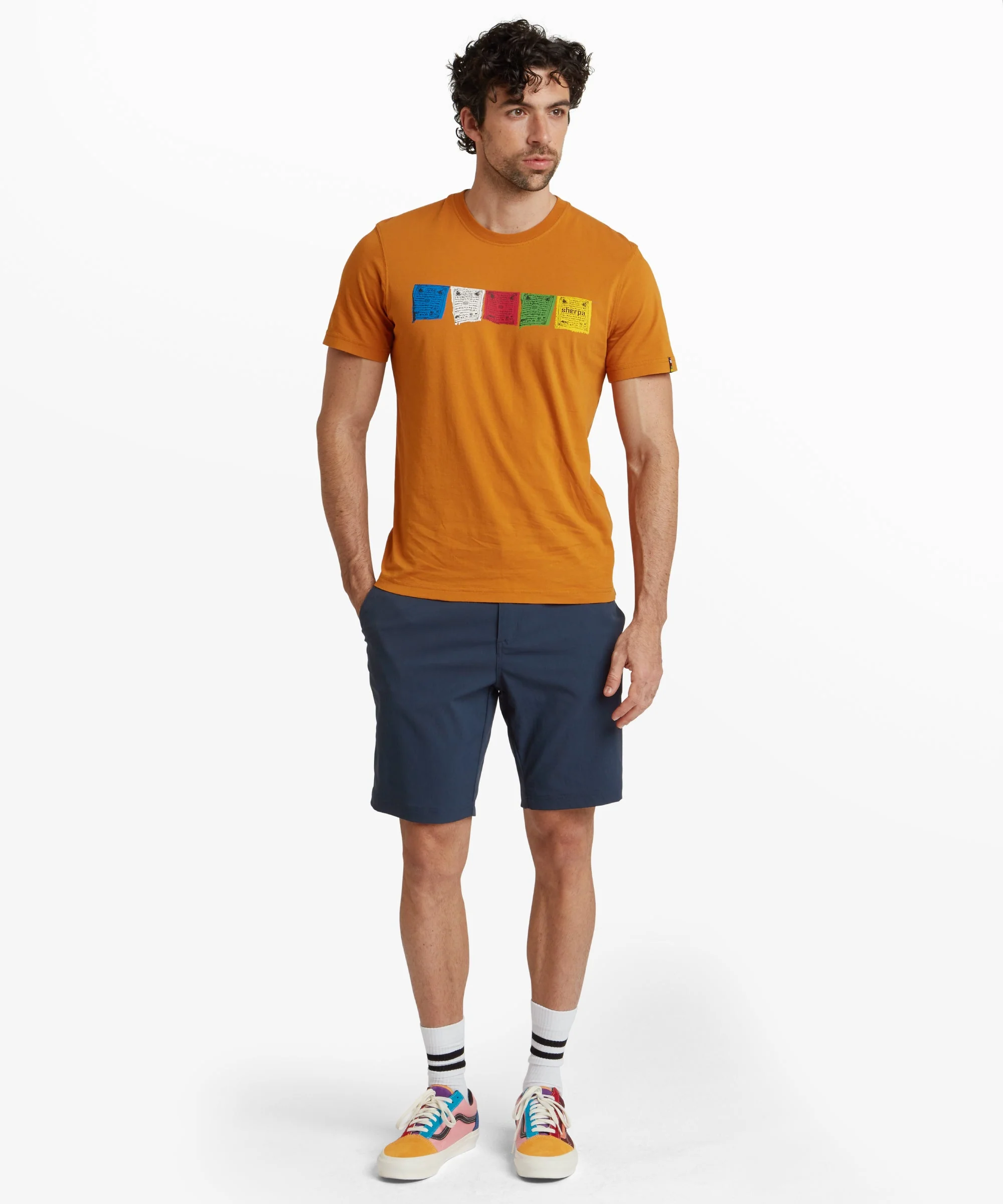 Tarcho is the name given to Tibetan prayer flags - colourful rectangular cloth, often found strung along mountain ridges and peaks high in the Himalayas. The vibrant prayer flags are depicted on the chest of this soft and durable addition to your summer wardrobe. We've also woven prayer flags into the classic crew neck of the tee to prevent it from stretching out of shape. A real dedication to the Tarcho.