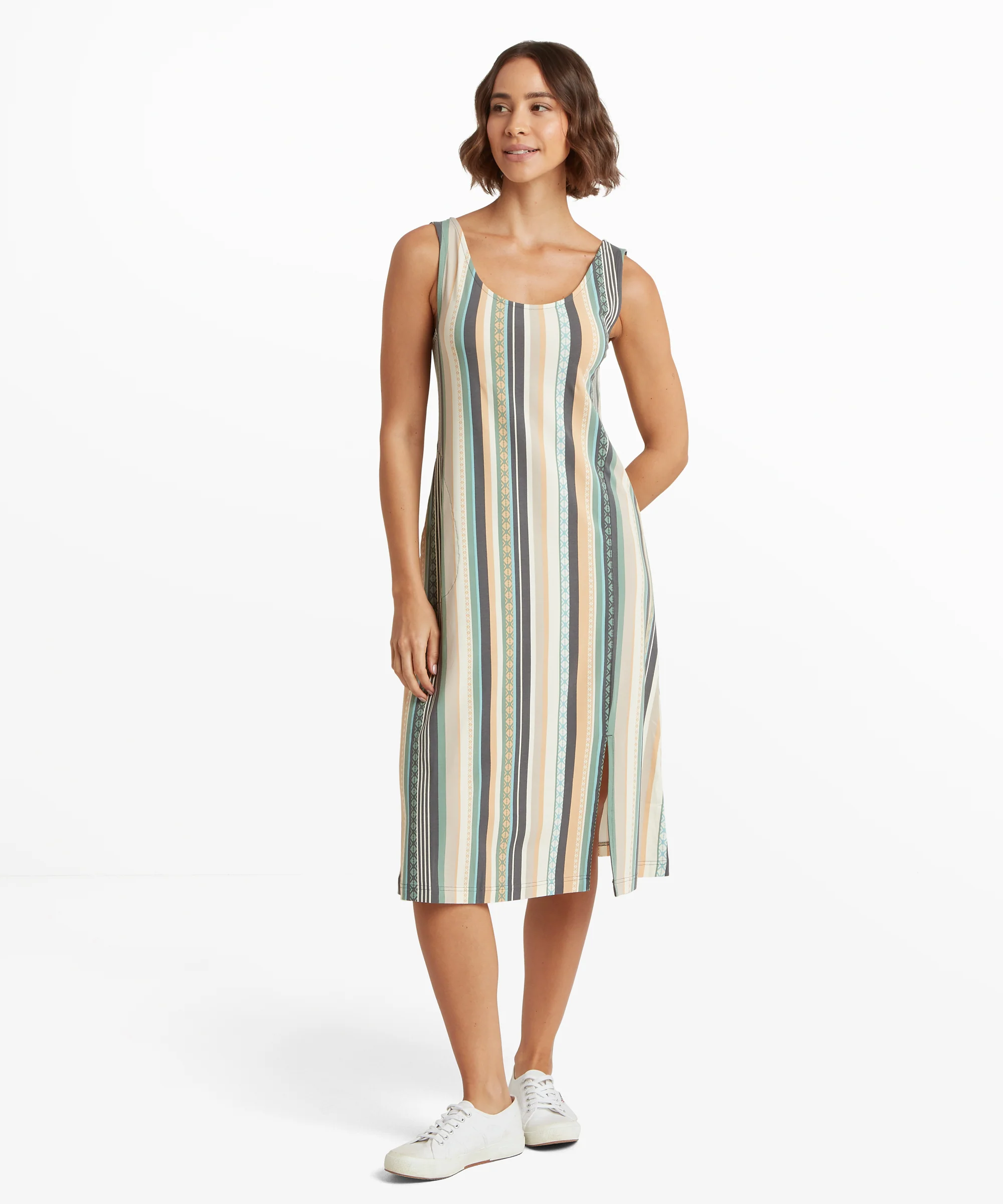 The Neha Long Tank Dress is designed for effortless comfort and everyday versatility. Made from a soft, breathable blend of modal, organic cotton and spandex, it offers a comfortable stretch and soft feel against the skin. Featuring an exclusive print design, a practical hand pocket and a flattering on-seam slit, this below-knee style moves with ease. Naturally durable, ultra-soft modal fibers and Oeko-Tex® certified materials provide all-day comfort and confidence in the materials. The Neha Long Tank Dress is a timeless, easy-to-wear piece that transitions seamlessly from relaxed days to casual outings.